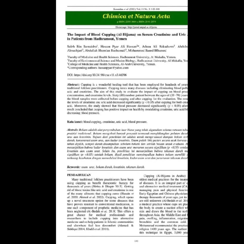 و كانت النتائج تؤكد التأثير الايجابي للحجامة على خفض ضغط الدم وكذلك تقليل نسبة الاملاح والسموم في الدم.