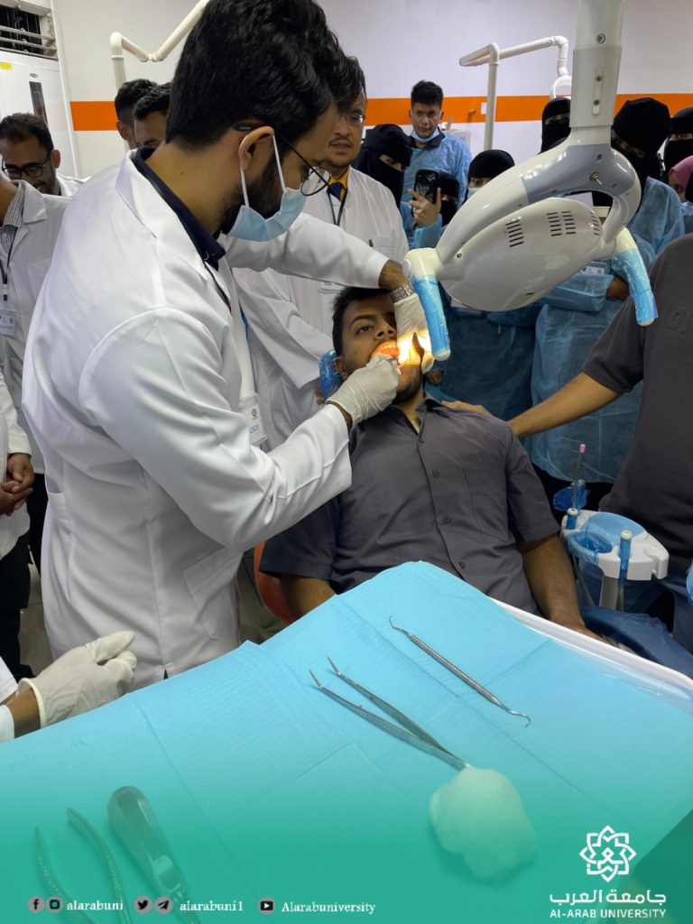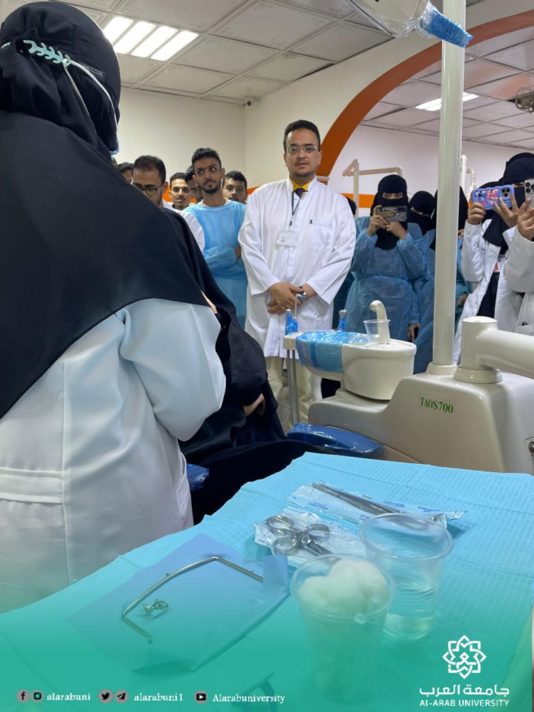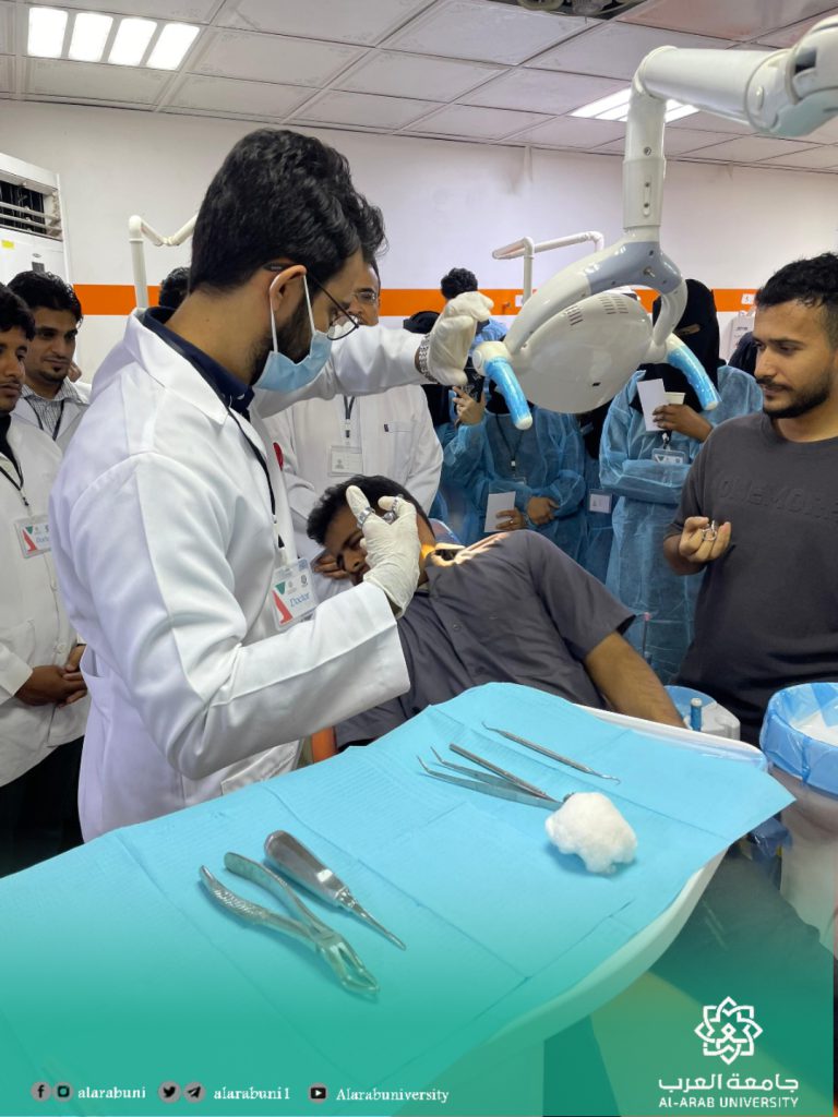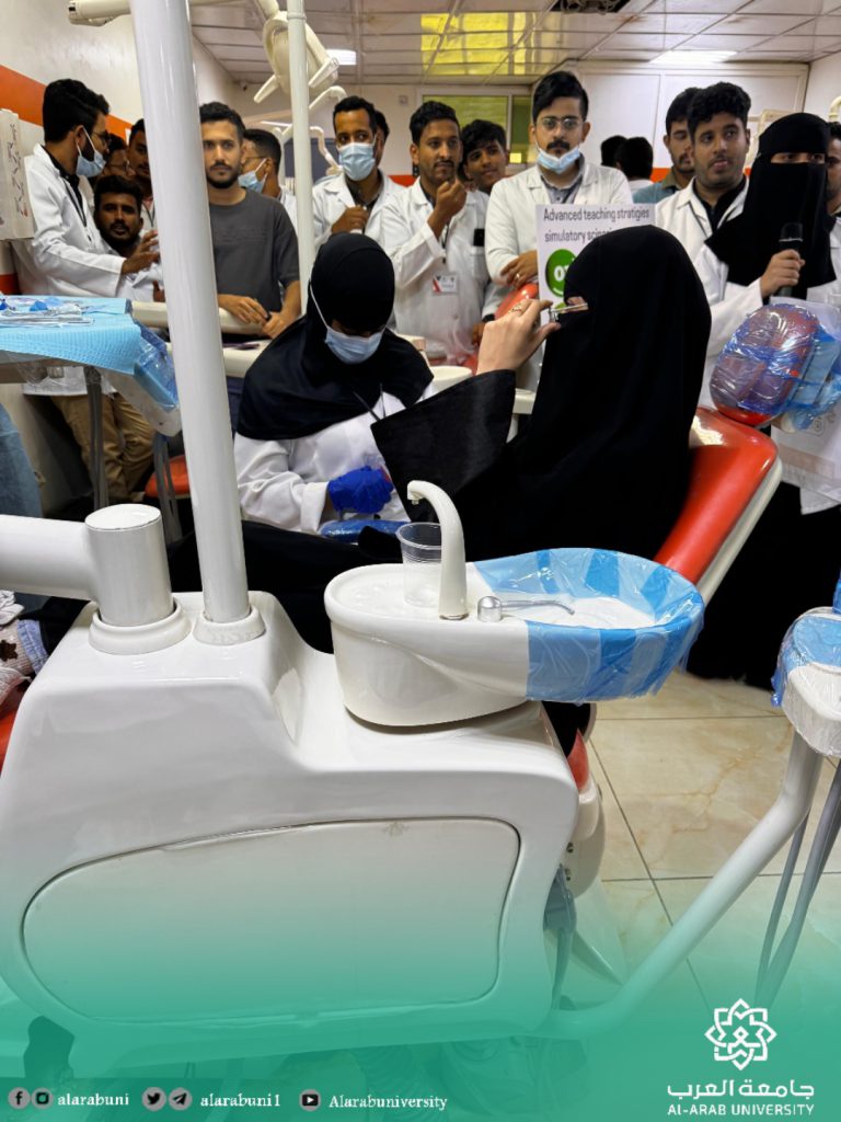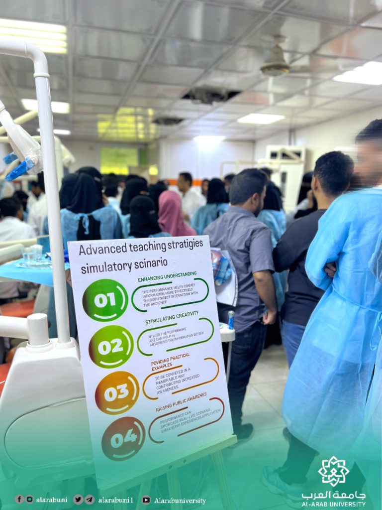 ضمن فعاليات اسبوع الجودة الاول بجامعة العرب الذي ينظم تحت شعار تحقيق التميز الأكاديمي والمهني في عصر التحول الرقمي والذكاء الاصطناعي جرى بكلية طب الاسنان تنفيذ سيناريو تمثيلي حول طرق التعلم الحديثة في الحصص العملية باستخدام (لعب الأدوار التمثيلية )قام بتنفيذه طلاب وطالبات الامتياز تحت اشراف اخصائيين برنامج طب وجراحة الفم والاسنان, وباشراف عام وتخطيط من مدير وحدة الجودة بالكلية الدكتور أحمد السعيدوتم تقسيم طلاب وطالبات الامتياز الى ثلاث مجموعات حيث قامت كل مجموعة بعمل سيناريو تمثيلي لطرق واستراتيجيات التعامل مع حالات خاصة مثل حالات مرضى الصرع والاطفال ذوي المقاومة العنيدة وحالات رفض اساليب العلاج المختلفة و من خلال السيناريو المرسوم تم تخطيط احداث كاملة للتعامل مع ممثلين قاموا بدور المرضى وكيف قام كل فريق بالتعامل مع تلك الحالاتوهدف السيناريو الى تدريب أعضاء هيئة التدريس على أساليب تدريس حديثة.