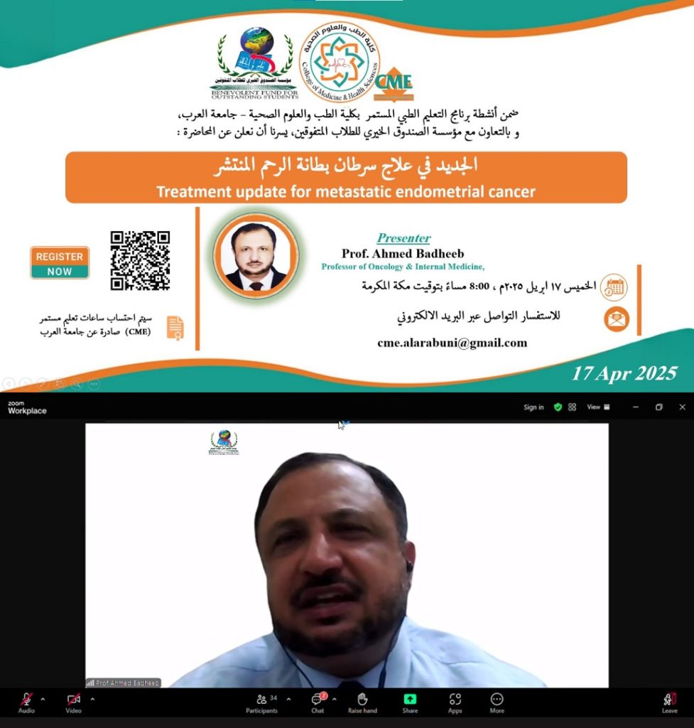 أقام برنامج التعليم الطبي المستمر بجامعة العرب وبالتعاون مع مؤسسة الصندوق الخيري محاضره من قبل البروفيسور أحمد باذيب مدير برنامج التعليم الطبي المستمر عبر قاعة زوم الافتراضية وكان بموضوع الجديد في علاج سرطان بطانة الرحم المنتشر باستخدام العلاج المناعي حيث أوضح خلال عرضه عن التصنيف الجديد لسرطان الرحم المبني على البيولوجيه الجزيئيه والذي يساعد الاطباء في اختيار الخطة العلاجيه بناء على معطيات الطفرات الجينية و الفحص النسيجي للصبغات المناعية. كما تحدث عن الخيارات المتاحة للعلاج الكيماوي والمناعي بناء على كل حاله على حده حسب الخريطه الجينية وسلوك السرطان#كلية_الطب_والعلوم_الصحية#جامعة_العرب_المكلا#التعليم_الطبي_المستمر#مؤسسة_الصندوق_الخيري#مؤسسة_الصندوق_الخيري_للطلاب_المتفوقين#cmeaau #aau #bffosscientficcommittee #BFFOS #scienceandethics #nbdaltafawuq_medical_Forum #nbdaltafawuq #towardsawaresociety