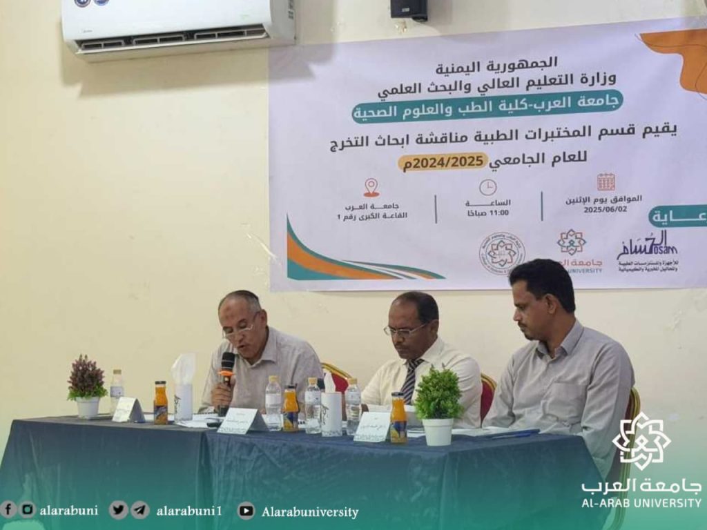 في أجواء أكاديمية مميزة، نُظّمت بجامعة العرب – كلية الطب والعلوم الصحية، برعاية نائب رئيس الجامعة وعميد كلية الطب الاستاذ الدكتور علي محمد باطرفي جلسة مناقشة مشاريع التخرج لطلاب المرحلة الرابعة، الدفعة الخامسة، قسم المختبرات الطبية، كأحد متطلبات نيل درجة البكالوريوس.