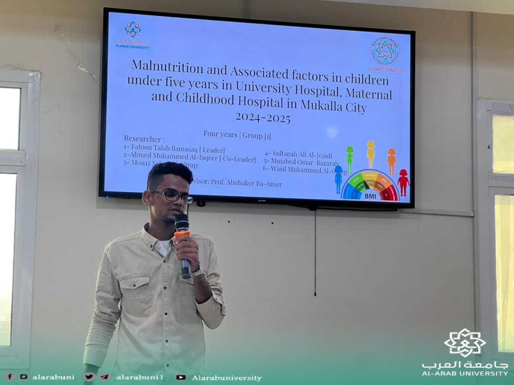 برعاية الدكتور عبود محمد العبل، رئيس الجامعة، نظمت كلية الطب والعلوم الصحية يوم الأربعاء الخامس والعشرين من يونيو ٢٠٢٥، ندوتها العلمية الثالثة لبرنامج الطب البشري، وذلك في القاعة الكبرى بالكلية، حيث تمت مناقشة بحوث المشاريع الميدانية لطلاب المستوى الرابع للعام الجامعي ٢٠٢٤/٢٠٢٥، والبالغ عددها ثلاثة بحوث ناقشت مواضيع مختلفة في القطاع الصحي.وقد أشادت لجنة التحكيم بمستوى الطلاب ومهاراتهم البحثية.وفي الختام، شكر الأستاذ الدكتور علي محمد باطرفي، نائب رئيس الجامعة وعميد كلية الطب، أعضاء اللجنة، وهنأ الطلاب على هذا الإنجاز العلمي، ودعا جميع الطلاب إلى الاستفادة من ملاحظات وتوجيهات لجنة التحكيم، وإجراء التعديلات المطلوبة منهم من قبل اللجنة.