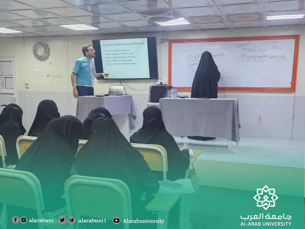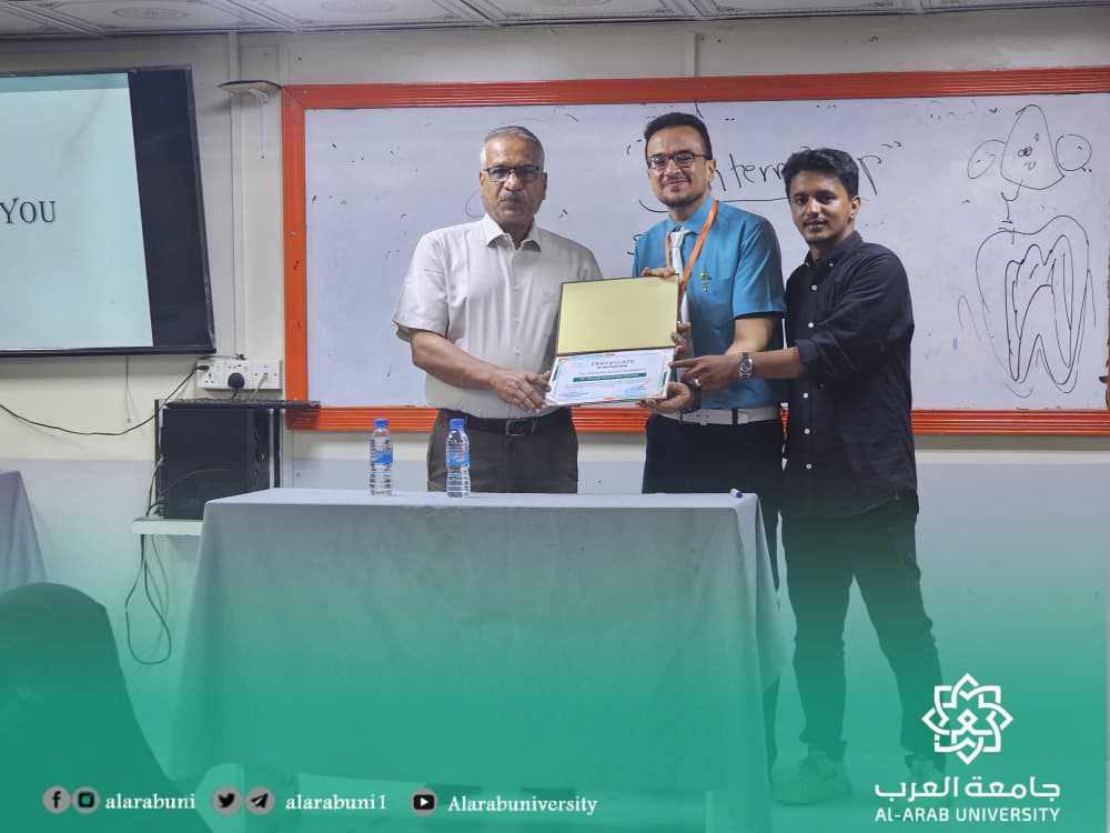 اختتمت كلية طب الأسنان بجامعة العرب، برعاية عميد الكلية الدكتور صالح سالم خنبش، فعاليات الدورة العلمية الأولى في مجال المصطلحات الطبية “Medical Terminology”، التي قدّمها الدكتور أحمد محمد السعيد،عضو هيئة التدريس بالكلية ، ونظمتها لجنة التعليم المستمر – قسم الأسنان، وذلك يوم الخميس الموافق 11 سبتمبر 2025م بمقر الكلية.وشهدت الدورة مشاركة طلاب المستوى الأول والمستوى الثاني، حيث حظوا بفرصة للتعرّف على أهم المفاهيم والمصطلحات الطبية التي تشكّل قاعدة أساسية لفهم العلوم الطبية وطب الأسنان.وأشاد الدكتور صالح خنبش بمستوى التفاعل الكبير من قبل الطلاب، مؤكداً أن تنظيم مثل هذه الدورات يأتي ضمن رؤية الكلية لتعزيز قدرات الطلبة وتأهيلهم أكاديمياً ومهنياً منذ المراحل الأولى لدراستهم الجامعية.من جانبهم عبّر الطلاب المشاركون عن شكرهم وامتنانهم لإدارة الكلية ولجنة التعليم المستمر على إتاحة مثل هذه الفرص العلمية المجانية التي تثري معارفهم وتدعم مسيرتهم التعليمية.
