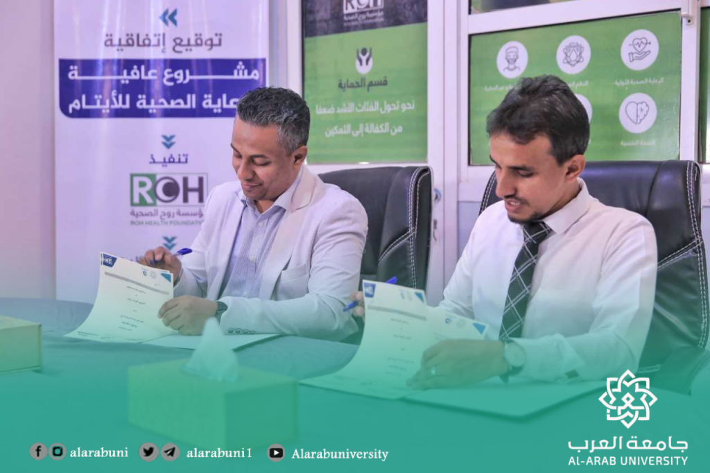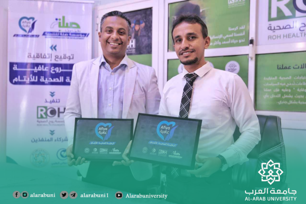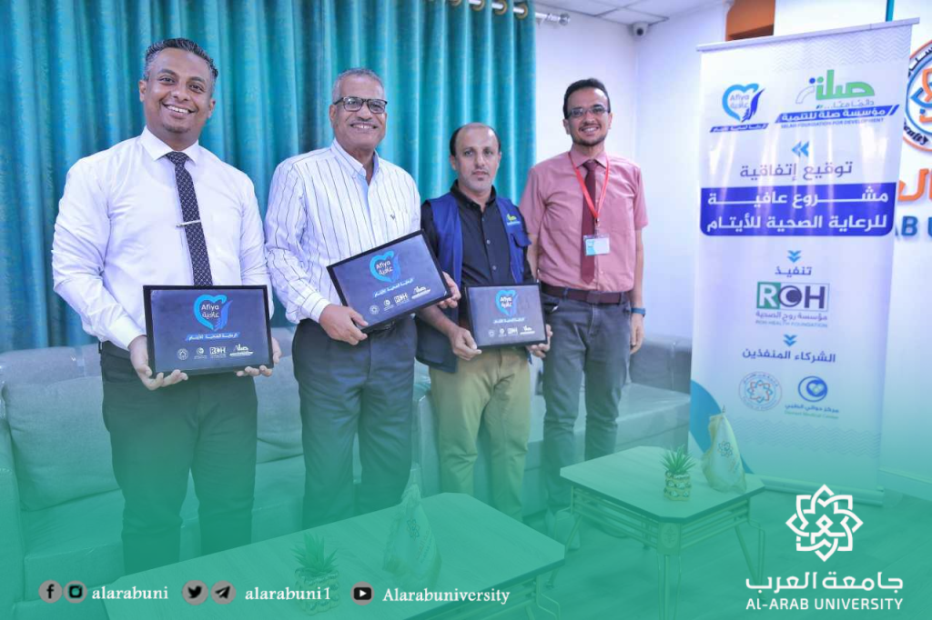 في إطار التزامها بدورها المجتمعي، شاركت كلية طب الأسنان بجامعة العرب في توقيع اتفاقية مشروع “عافية” الصحي الذي يهدف إلى تقديم خدمات الرعاية الصحية الشاملة للأيتام وأمهاتهم في مدينة المكلا، ليستفيد من المشروع نحو 500 يتيم وأمهاتهم.ويأتي المشروع بتمويل من مؤسسة صلة للتنمية وتنفيذ مؤسسة روح الصحية، وبمشاركة مركز دوائي الطبي، حيث يشمل حزمة متكاملة من الخدمات الطبية في عدد من التخصصات (الأطفال، الباطنية، العيون، والأسنان)، إلى جانب الفحوصات المخبرية وصرف الأدوية مجاناً، إضافة إلى توزيع حقائب النظافة الشخصية. ويهدف المشروع بالدرجة الأولى إلى الكشف المبكر عن الأمراض وتعزيز الوعي الصحي والوقاية.وفي هذا السياق، أكد الدكتور صالح سالم خنبش، عميد كلية طب الأسنان بجامعة العرب، أن الشراكة مع مؤسسات المجتمع المدني تمثل تجسيداً للمسؤولية المجتمعية وتفتح آفاقاً لتقديم خدمات صحية نوعية تسهم في رفع مستوى صحة المجتمع.كما أشار الدكتور محمد باهيثم، مدير قطاع الصحة في مؤسسة صلة للتنمية، إلى أن المشروع يعكس التزام المؤسسة بتعزيز حق الفئات الأشد حاجة في الحصول على الرعاية الصحية، فيما أوضح الدكتور محمد باجرش، المدير التنفيذي لمؤسسة روح الصحية، أن المشروع جاء استجابة للظروف الصعبة التي يواجهها الأيتام وأمهاتهم، لتأمين شبكة أمان صحية تحفظ كرامتهم وتدعم حياتهم.حضر مراسم توقيع الاتفاقية كل من:الدكتور أحمد محمد السعيد أبو العطا، نائب عميد كلية طب الأسنان.الدكتور سالم عمر باهيثم، مدير مركز دوائي.المهندس حسن محمد باشماخ، مدير قسم الحماية ومنسق المشروع.