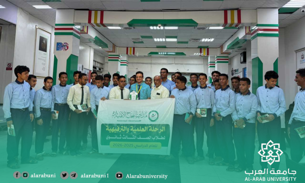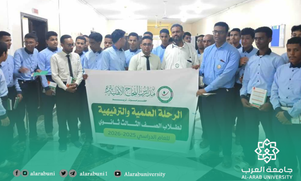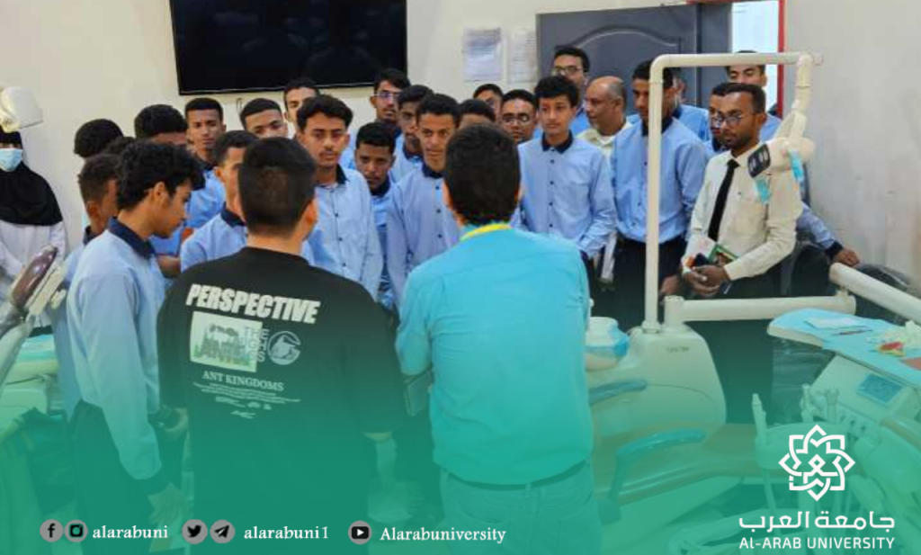 استضافت جامعة العرب وفدًا طلابيًا من القسم العلمي بـ مدارس النجاح الأهلية بحضرموت – تريم، وذلك ضمن جهود الجامعة لتعزيز التواصل مع المؤسسات التعليمية والتعريف ببرامجها الأكاديمية وتخصصاتها المختلفة.وكان في استقبال الوفد الأستاذ منير بتيس مدير عام الأنشطة بالجامعة، حيث قُدِّم للطلاب برنامج تعريفي تضمّن عرضًا مبسطًا عن الجامعة وكلياتها وأقسامها، ونظام الدراسة، والفرص التعليمية والتدريبية المتاحة للطلبة.وعقب ذلك، نُظّمت جولة ميدانية للوفد بإشراف اللجنة الإعلامية، شملت زيارة عدد من مرافق الجامعة ومصادر التعليم والتدريب في كلية طب الأسنان، وكلية الطب والعلوم الصحية، وكلية العلوم الإدارية، وكلية الهندسة وتقنية المعلومات، حيث اطّلع الطلاب على القاعات الدراسية، والمعامل، والعيادات التعليمية، وغيرها من المرافق التي تعكس البيئة الأكاديمية والتطبيقية داخل الجامعة.كما تم خلال الزيارة توعية الطلاب بأهمية اختيار التخصصات الجامعية المناسبة لقدراتهم وطموحاتهم، والتعريف بالتخصصات الملائمة لطلاب القسم العلمي وفق شروط القبول المعتمدة.وفي ختام الزيارة، عبّر معلمو المدرسة عن شكرهم وتقديرهم لجامعة العرب على حفاوة الاستقبال وحسن التنظيم، وتم تبادل الدروع والهدايا التذكارية، مع التأكيد على أهمية استمرار التعاون وتنفيذ أنشطة وبرامج مشتركة مستقبلًا بين المدرسة والجامعة.وتأتي هذه الزيارة ضمن أنشطة الجامعة الرامية إلى خدمة المجتمع وتعزيز الشراكة مع المؤسسات التعليمية، وتشجيع الطلبة على التخطيط المبكر لمساراتهم الأكاديمية والمهنية.
