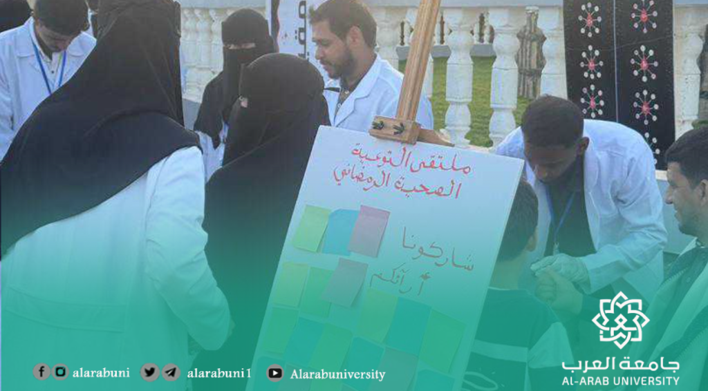 في إطار الاستعداد لاستقبال شهر رمضان المبارك، نظّمت كليات الطبية بجامعة العرب ملتقى توعويًا صحيًا تثقيفيًا بعنوان “ملتقى التوعية الصحية الرمضاني”، وذلك في ملاهي بن هلابي.وشاركت في الملتقى كليات الطبية, ممثلةً بكلية الطب والعلوم الصحية وكلية طب الأسنان، بما يعكس تكامل التخصصات الصحية والعمل بروح الفريق لخدمة المجتمع.وتضمن الملتقى عددًا من الأجنحة الصحية المتخصصة، شملت جناح الطب العام والاستقبال، وجناح طب الأسنان، وجناح الصيدلة، وجناح المختبرات، إضافة إلى أجنحة الضيافة والتغذية الصحية، حيث قُدمت إرشادات توعوية حول التغذية السليمة خلال شهر رمضان المبارك، مع توزيع مواد تثقيفية موجهة للزوار.واستفاد أكثر من 380 زائرًا من الخدمات المقدمة على مدار اليوم، والتي شملت فحص الأسنان، وقياس ضغط الدم، وقياس مستوى السكر في الدم، إضافة إلى تقديم التوعية الصحية والإرشادات الوقائية، مع دعوة الزوار إلى زيارة عيادات الجامعة المجانية لاستكمال العلاج والمتابعة عند الحاجة.وقد عبّر الزوار عن تقديرهم لهذه المبادرة المجتمعية النوعية، مثمنين دور جامعة العرب وكلياتها الصحية في تعزيز الوعي الصحي وترسيخ مفهوم الخدمة المجتمعية، لا سيما مع اقتراب شهر رمضان المبارك.وأقيم الملتقى برعاية كريمة من رئيس الجامعة الدكتور عبود محمد العبل، وبمتابعة وإشراف إداري من الأستاذ منير باتيس مدير عام الأنشطة بالجامعة، وبإشراف طبي وإكلينيكي من الدكتور أحمد السعيد نائب عميد كلية طب الأسنان، فيما تولّى الطالب محمد با نافع مهام التنسيق والتنظيم الميداني.ويأتي تنظيم هذا الملتقى ضمن سلسلة من الأنشطة والفعاليات المجتمعية التي تحرص جامعة العرب على تنفيذها، تأكيدًا لدورها في خدمة المجتمع، وربط الجانب الأكاديمي بالتطبيق العملي الميداني، بما يسهم في تعزيز الصحة العامة ونشر ثقافة الوقاية بين أفراد المجتمع.
